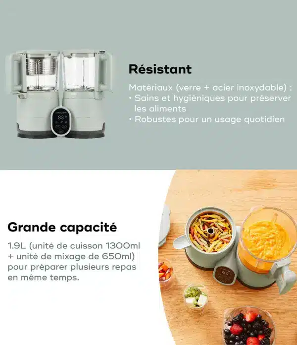 Contrairement aux bols en plastique, le robot Nutribaby Glass assure une préparation sans transfert de goût ni de particules indésirables. Le verre est un matériau naturel, hygiénique et durable, qui garde intacte la saveur des fruits, légumes et viandes. Avec sa cuisson vapeur express, vous gagnez du temps tout en offrant à votre enfant des repas de qualité.