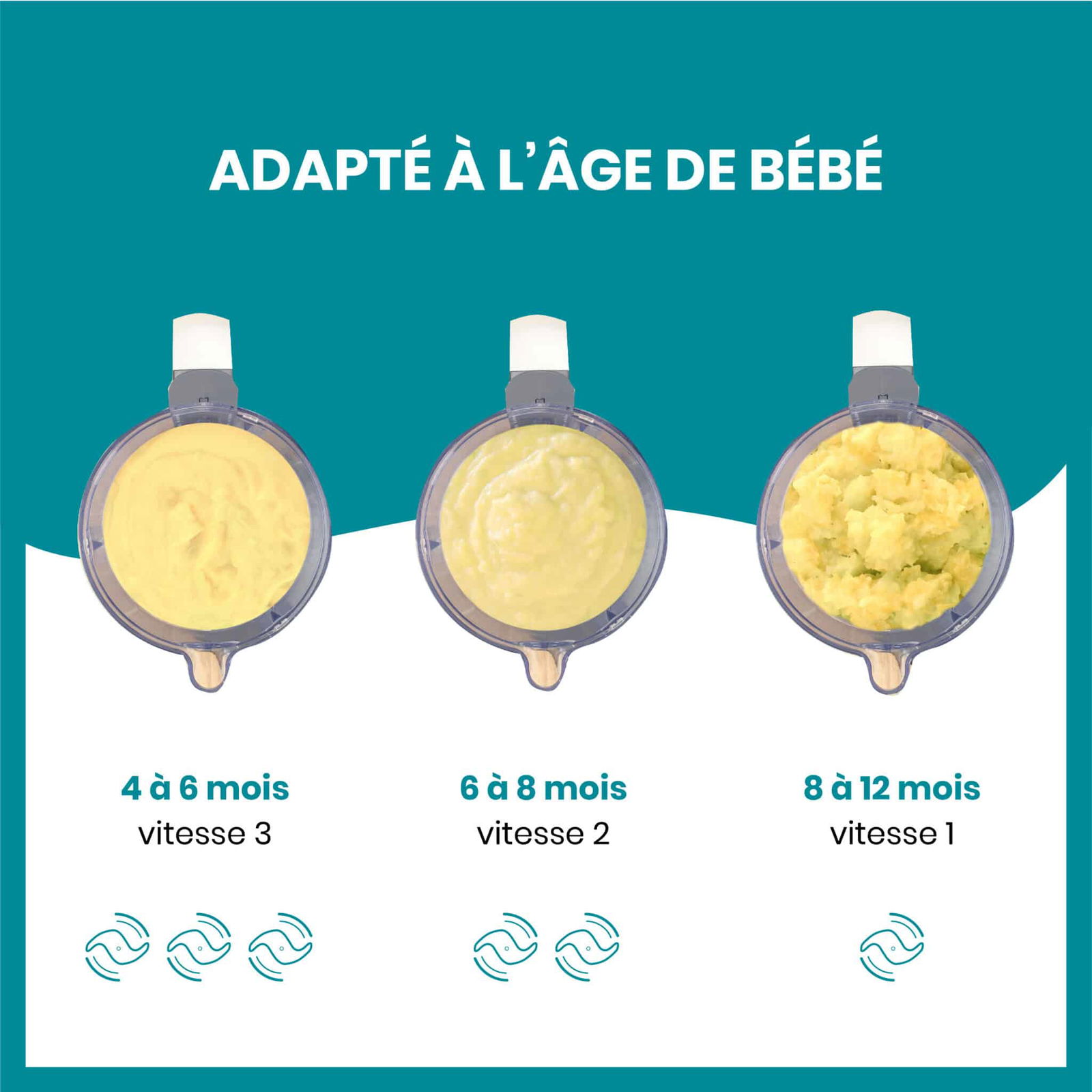 Ses 3 vitesses de mixage associées au récupérateur de jus de cuisson vous permettent d’ajuster la texture souhaitée, pour offrir à bébé le meilleur des purées.