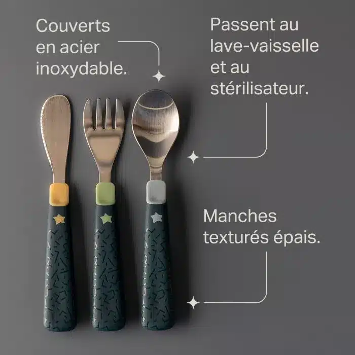 Par ailleurs, la sécurité est primordiale. Ainsi, les bouts parfaitement arrondis de la cuillère et de la fourchette éliminent les risques de blessures. Enfin, le matériau inox assure une hygiène impeccable et une grande durabilité, résistant aux chocs des repas parfois mouvementés.