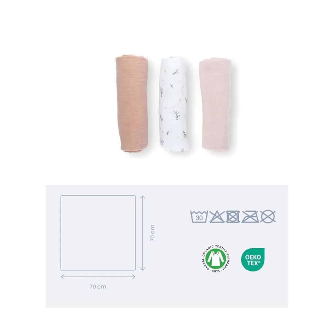 ❓ FAQ – Doomoo lot de 3 langes muslin 70×70 Flower Pink