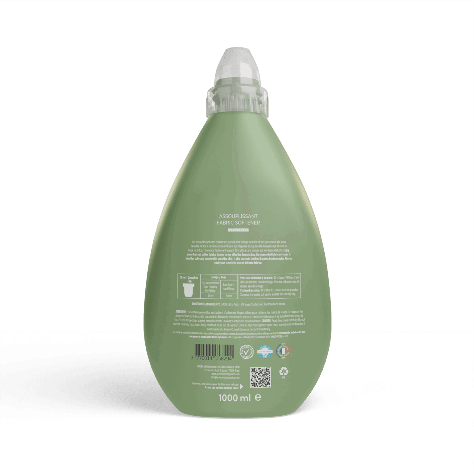 Green Mood Assouplissant 1L – Adoucissant Hypoallergénique Sans Parfum pour Bébé
