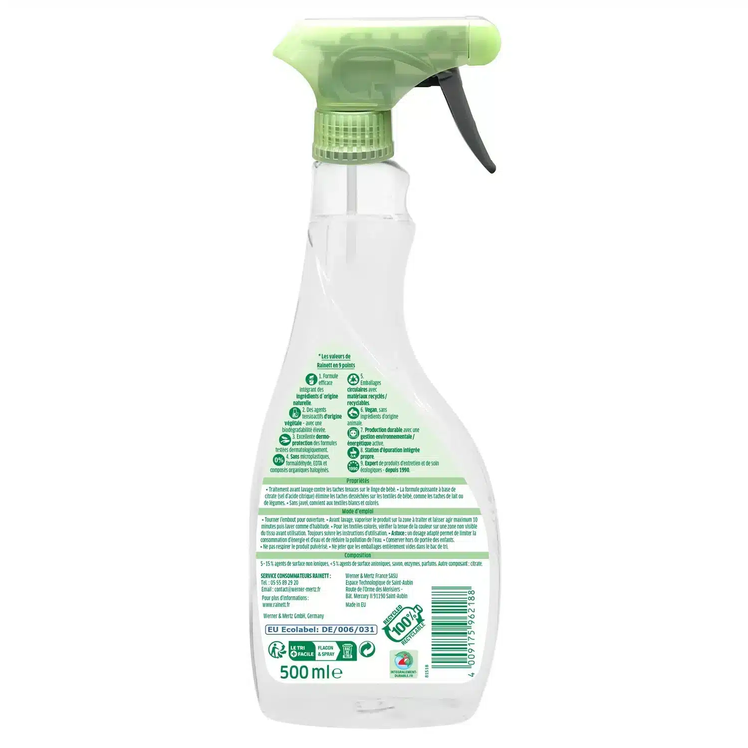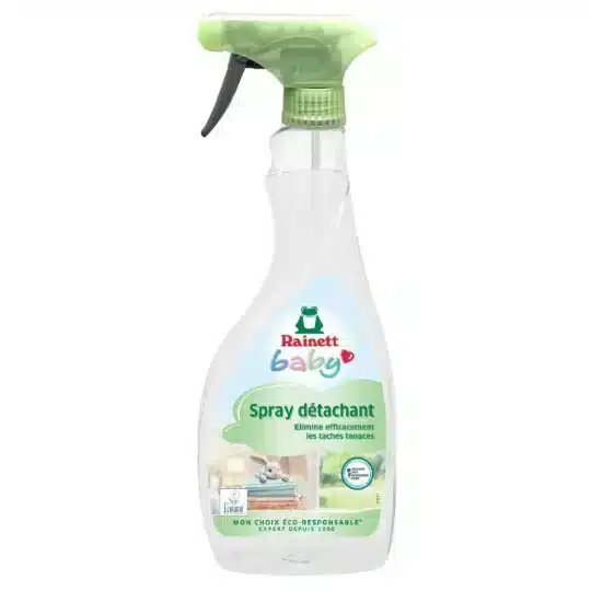 Le détachant bébé Rainett est présenté en spray pratique pour une application ciblée. Il agit directement sur la zone tachée avant le passage en machine. Son efficacité a été testée dermatologiquement afin de garantir un usage quotidien sans danger.